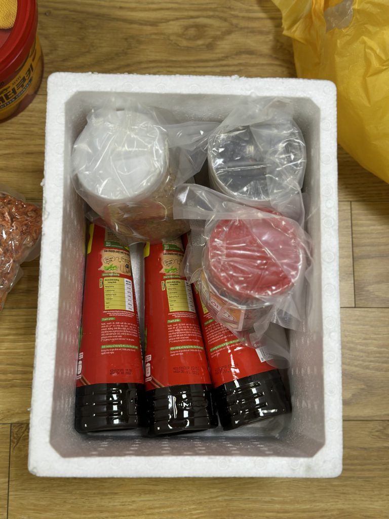 Gia vị: Muối tôm, muối ớt, sa tế, nước tương (cần đóng gói đặc biệt).